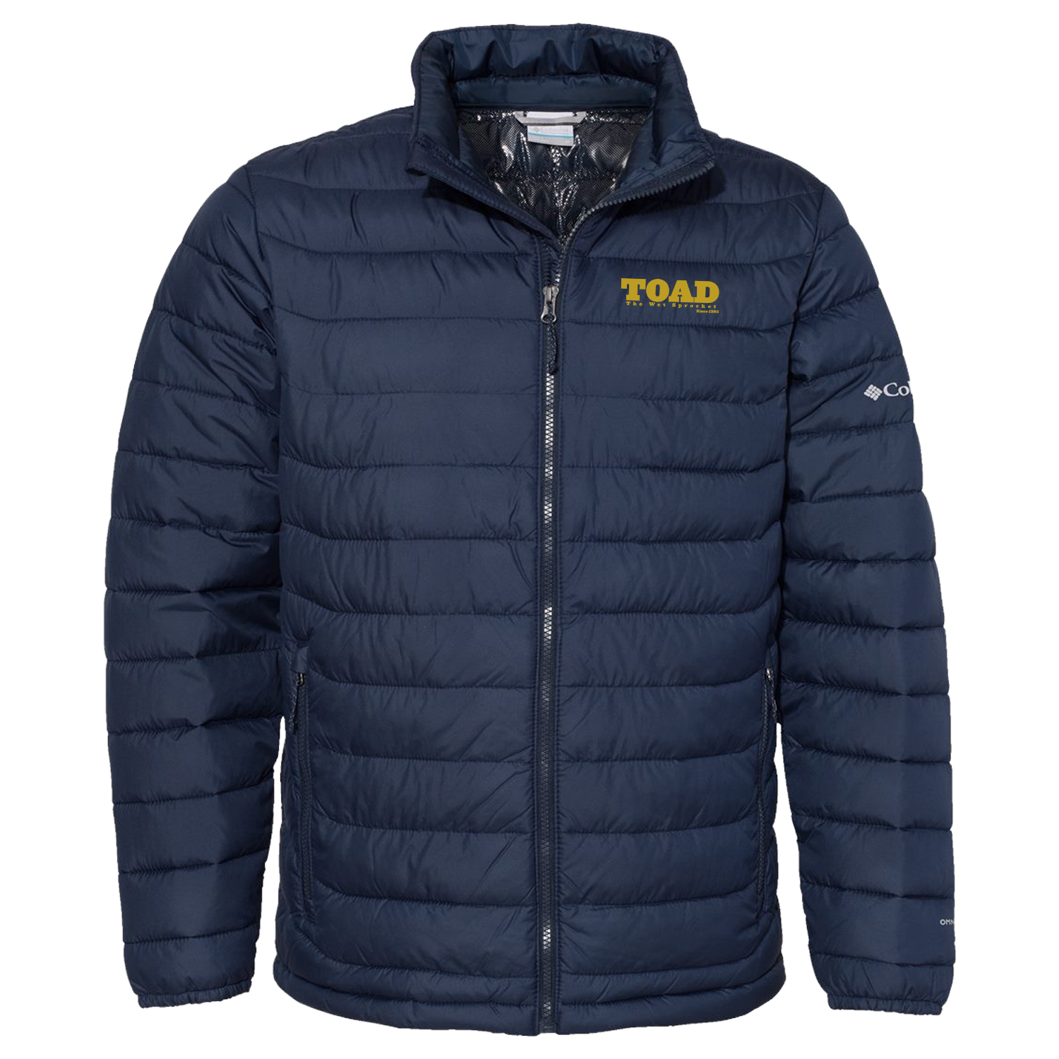 This custom Columbia jacket features Toad's logo across the front left breast. This jacket is made of water resistant fabric and features Omni-Heat thermal reflective lining and Thermarator insulation. The hem has an adjustable drawcord, and the pockets are zippered.